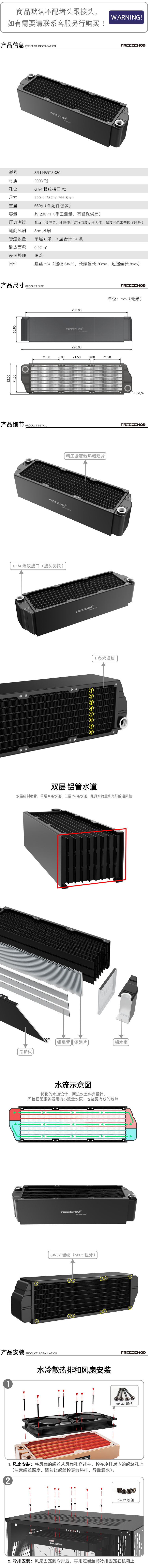 FREEZEMOD服务器水冷8CM散热排SR-LH65T3X80铝排65mm厚3层Z水道