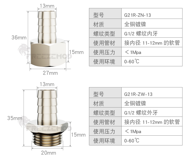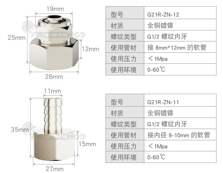 FREEZEMOD散热器水箱旋转软管接头G1/2内外牙六角扳手位黄铜镀镍