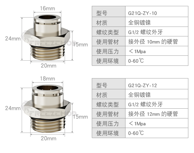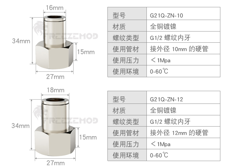 FREEZEMOD散热器水箱旋转硬管接头G1/2内外牙六角扳手位黄铜镀镍